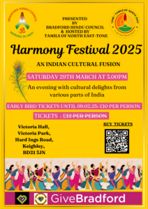 We’re excited to announce that the Harmony Festival 2025 is back on the 29th of March. This event is an initiative by Bradford Hindu Council and Organised by ToNE -Tamils of North East to showcase and promote our rich Indian culture to a wider audience in Yorkshire. It’s a wonderful opportunity to highlight the beauty of various Indian cultures to a diverse group in the region. Additionally, the festival will celebrate several Indian New Years that fall in April, including Ugadi/Yugadi (Telugu and Kannada), Gudi Padwa (Marathi), Vishu (Malayali), Puthandu (Tamil), Pohela Boishakh (Bengali), Baisakhi/Vaisakhi (Punjabi), Cheti Chand (Sindhi), and Vishu (Konkani).